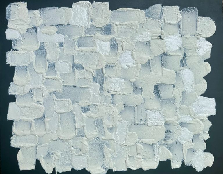 Works alternate between acrylic and mixed media on canevas and ink traces on structured paper